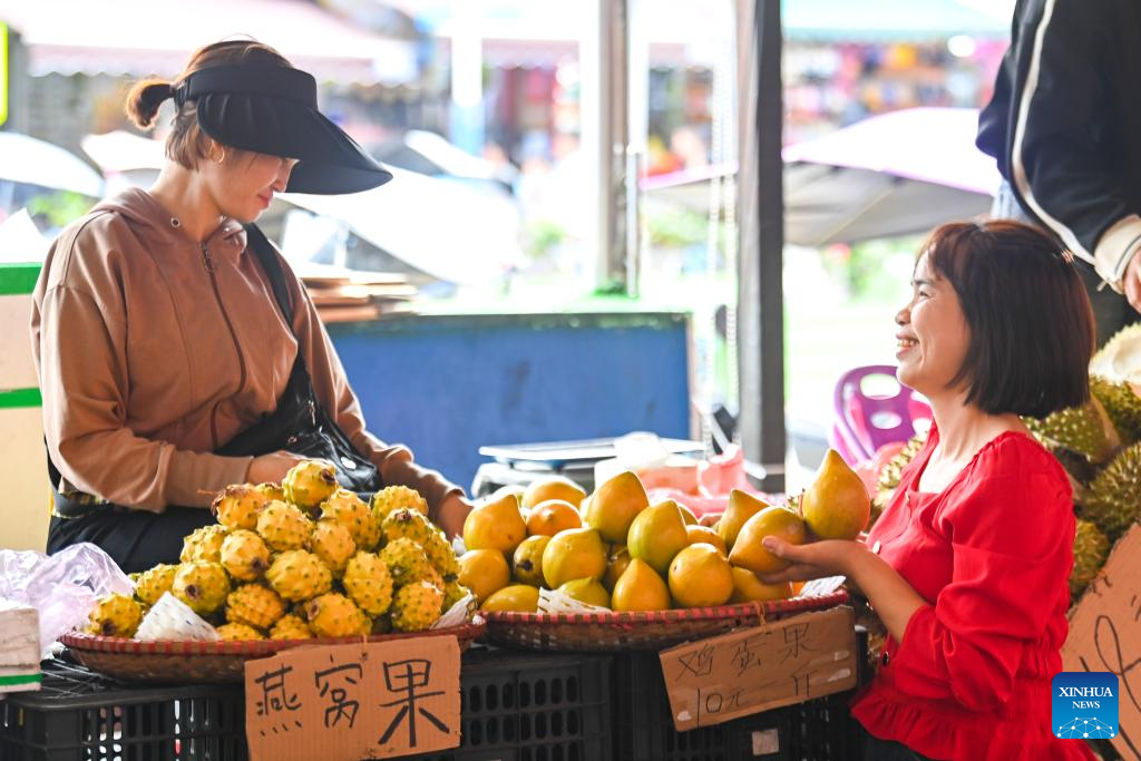 A customer purchases imported fruits at a market near the Dongxing port in Dongxing, south China's Guangxi Zhuang Autonomous Region, April 17, 2025. Over the years, along with the deepening of the Belt and Road Initiative (BRI) and the development of the New International Land-Sea Trade Corridor, export and import of agricultural products between China and Southeast Asia countries have been continuously strengthened. Agricultural products from both sides won great popularity among the buyers. (Xinhua/Cao Yiming)