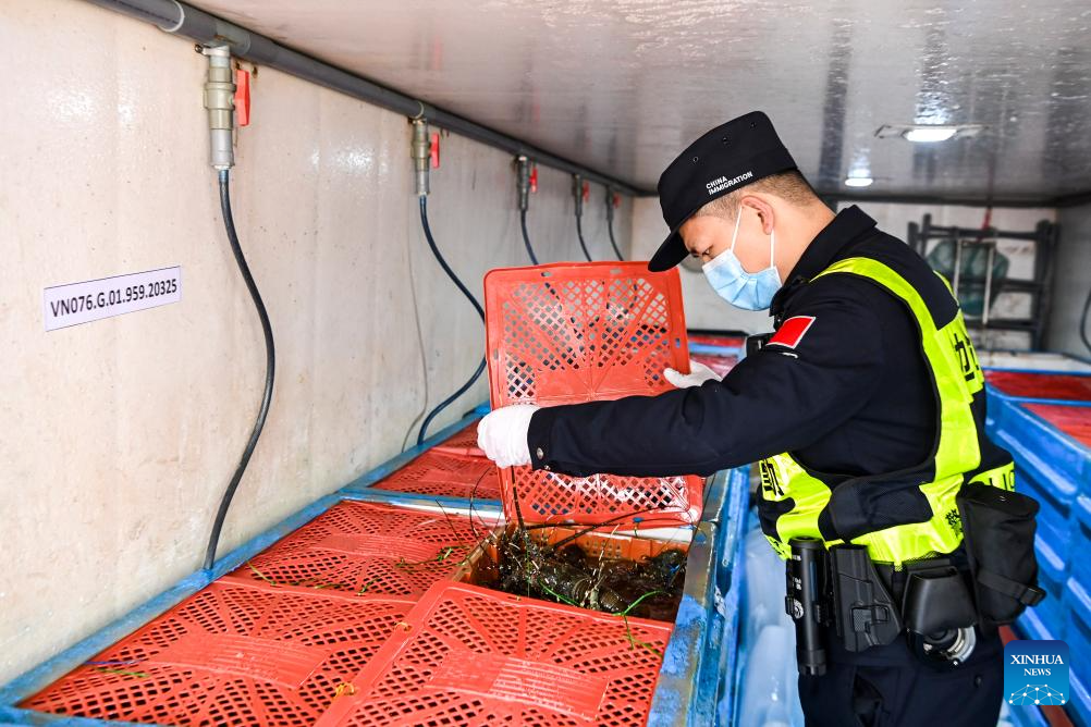 A staff member checks imported seafood at Dongxing port in Dongxing, south China's Guangxi Zhuang Autonomous Region, March 18, 2025. Over the years, along with the deepening of the Belt and Road Initiative (BRI) and the development of the New International Land-Sea Trade Corridor, export and import of agricultural products between China and Southeast Asia countries have been continuously strengthened. Agricultural products from both sides won great popularity among the buyers. (Xinhua/Cao Yiming)