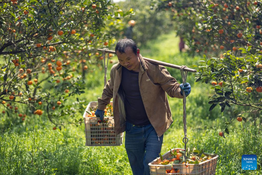 (250423) -- CHONGQING, April 23, 2025 (Xinhua) -- A villager carries newly-picked tangerines for export in Heyan Village of Changshou District, southwest China's Chongqing Municipality, March 24, 2025. Over the years, along with the deepening of the Belt and Road Initiative (BRI) and the development of the New International Land-Sea Trade Corridor, export and import of agricultural products between China and Southeast Asia countries have been continuously strengthened. Agricultural products from both sides won great popularity among the buyers. (Xinhua/Huang Wei)