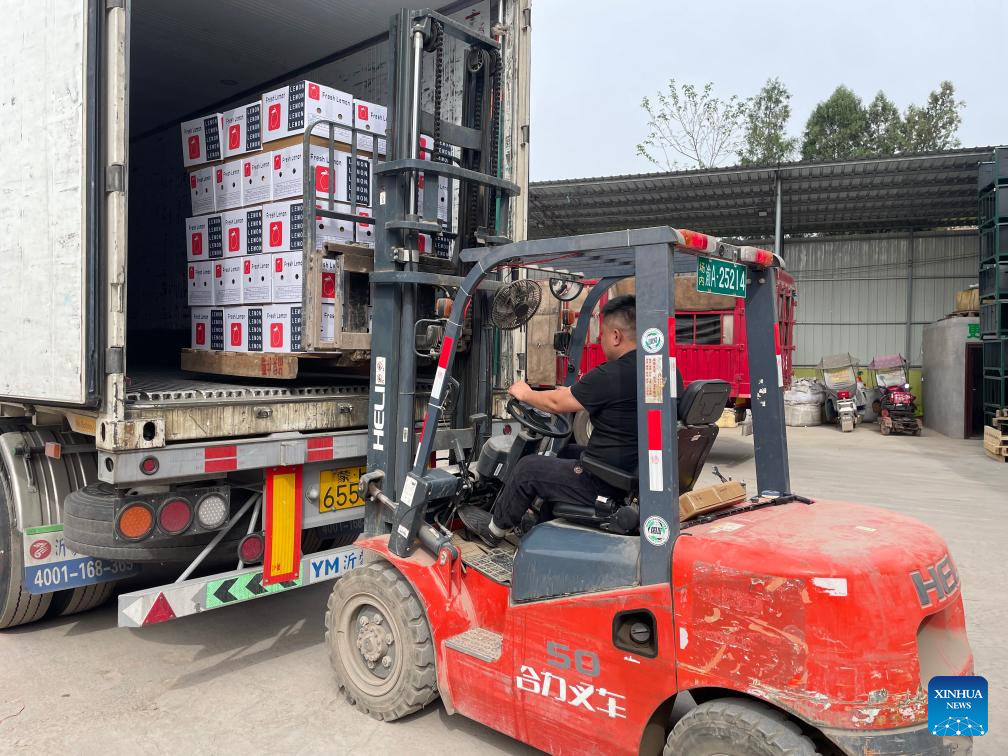 (250423) -- CHONGQING, April 23, 2025 (Xinhua) -- A staff member loads packed lemons for export onto a truck at a fruit company in southwest China's Chongqing Municipality, April 14, 2025. Over the years, along with the deepening of the Belt and Road Initiative (BRI) and the development of the New International Land-Sea Trade Corridor, export and import of agricultural products between China and Southeast Asia countries have been continuously strengthened. Agricultural products from both sides won great popularity among the buyers. (Xinhua)