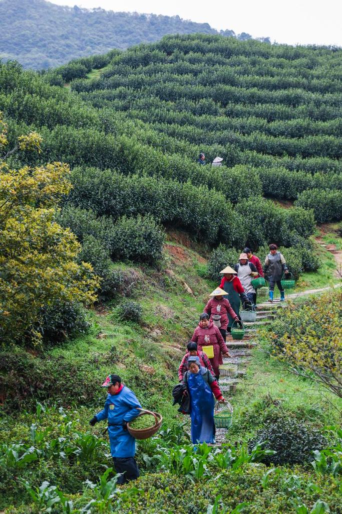 In spring, the tea harvest in Zhejiang Province is in full swing.