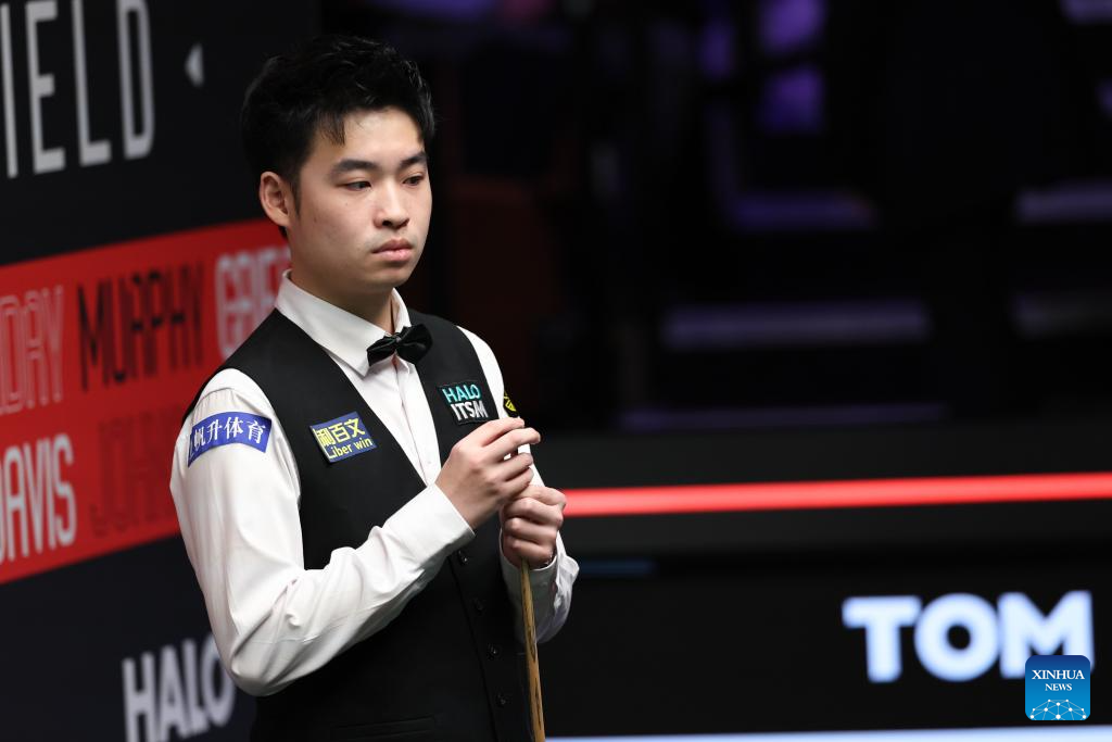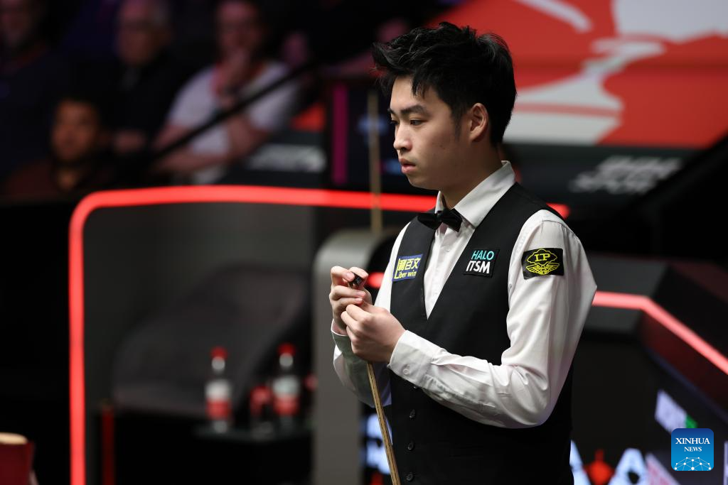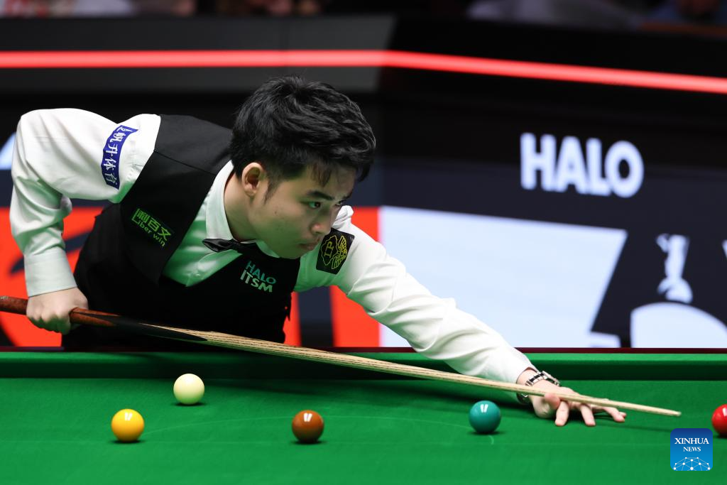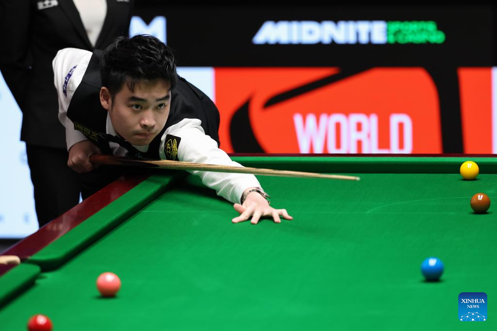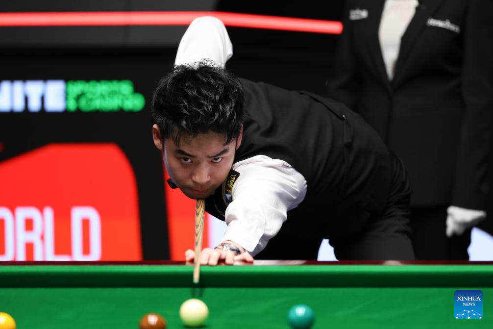 Si Jiahui of China competes during the round 1 match against David Gilbert of England at World Snooker Championship 2025 in Sheffield, Britain, April 22, 2025. (Photo by Zhai Zheng/Xinhua)