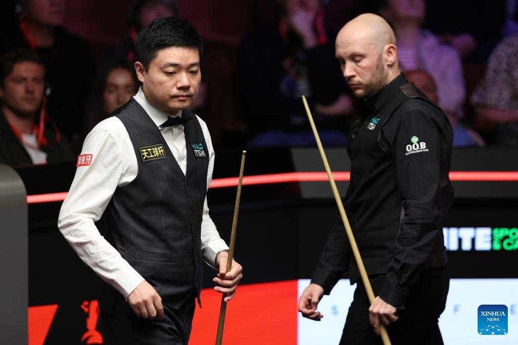 Ding Junhui (R) of China celebrates after the round 1 match against Zak Surety of England at World Snooker Championship 2025 in Sheffield, Britain, April 22, 2025. (Photo by Zhai Zheng/Xinhua)