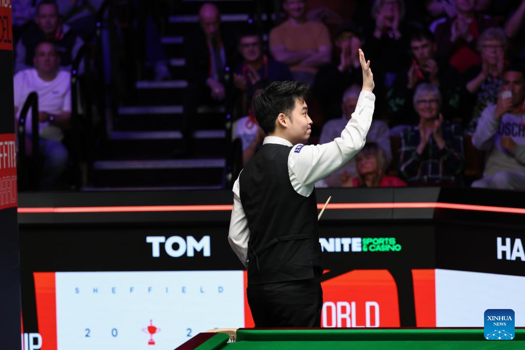 Si Jiahui of China celebrates after the round 1 match against David Gilbert of England at World Snooker Championship 2025 in Sheffield, Britain, April 22, 2025. (Photo by Zhai Zheng/Xinhua)