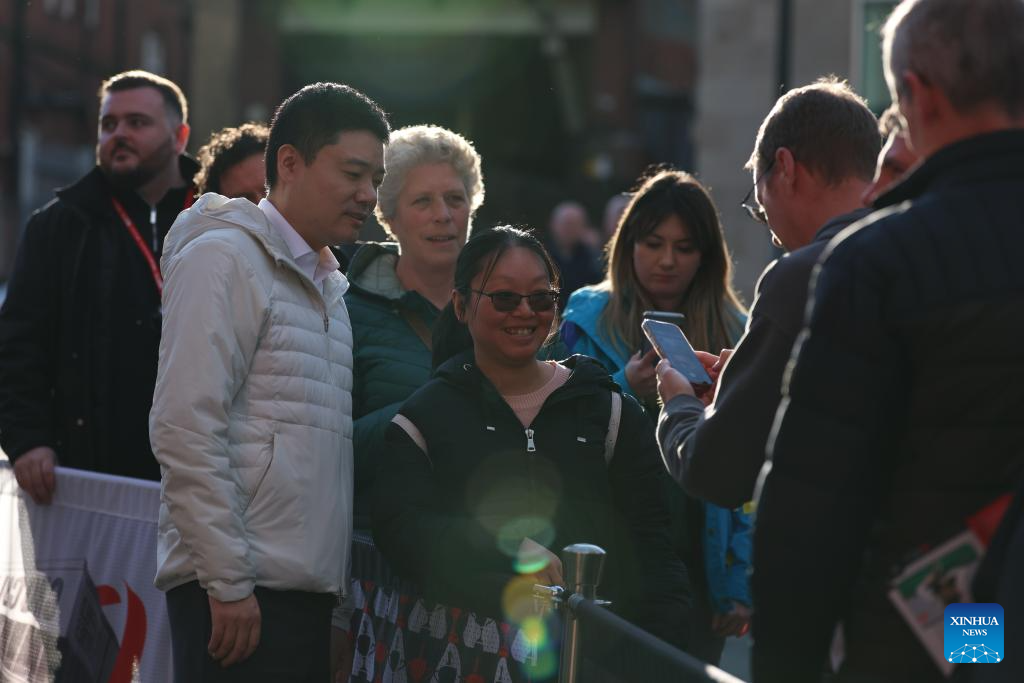 Ding Junhui (L, front) of China communicates with supporters after the round 1 match against Zak Surety of England at World Snooker Championship 2025 in Sheffield, Britain, April 22, 2025. (Photo by Zhai Zheng/Xinhua)