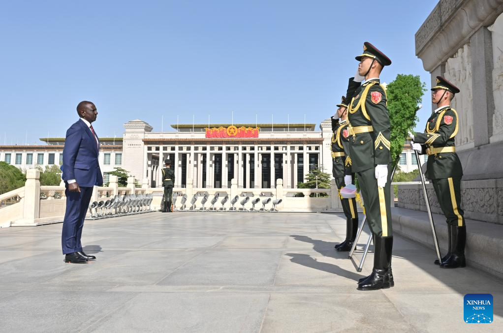 Kenyan President William Ruto lays a wreath at the Monument to the People's Heroes on Tian'anmen Square in Beijing, capital of China, April 23, 2025. (Xinhua/Yue Yuewei)