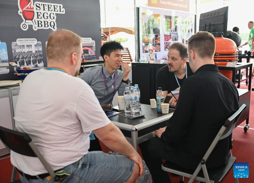 Buyers learn about barbecue accessories during the 137th China Import and Export Fair in Guangzhou, south China's Guangdong Province, April 23, 2025. The second phase of the 137th China Import and Export Fair, also known as Canton Fair, focusing on quality home furnishings, opened on Wednesday with more than 10,000 exhibiting companies. (Xinhua/Xiao Ennan)