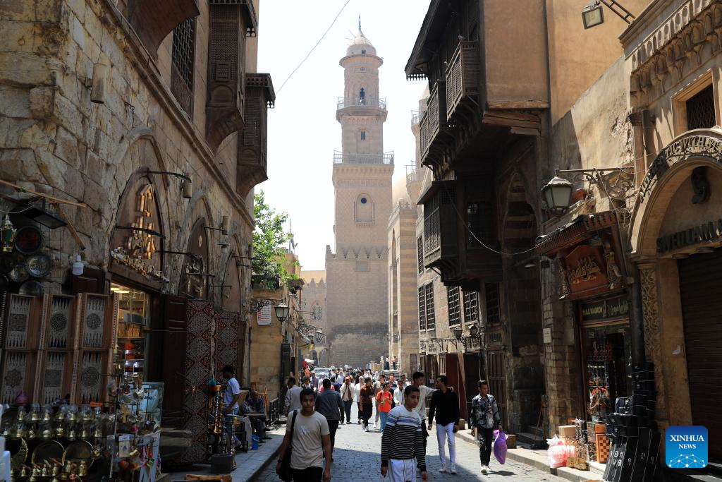 People walk on the Al-Muizz Street in Cairo, Egypt, on April 19, 2025. With its sea of minarets, centuries-old mosques, and timeworn alleys, Cairo--a city steeped in history--is undertaking a massive effort to protect and revitalize its cultural and architectural heritage. (Xinhua/Sui Xiankai)