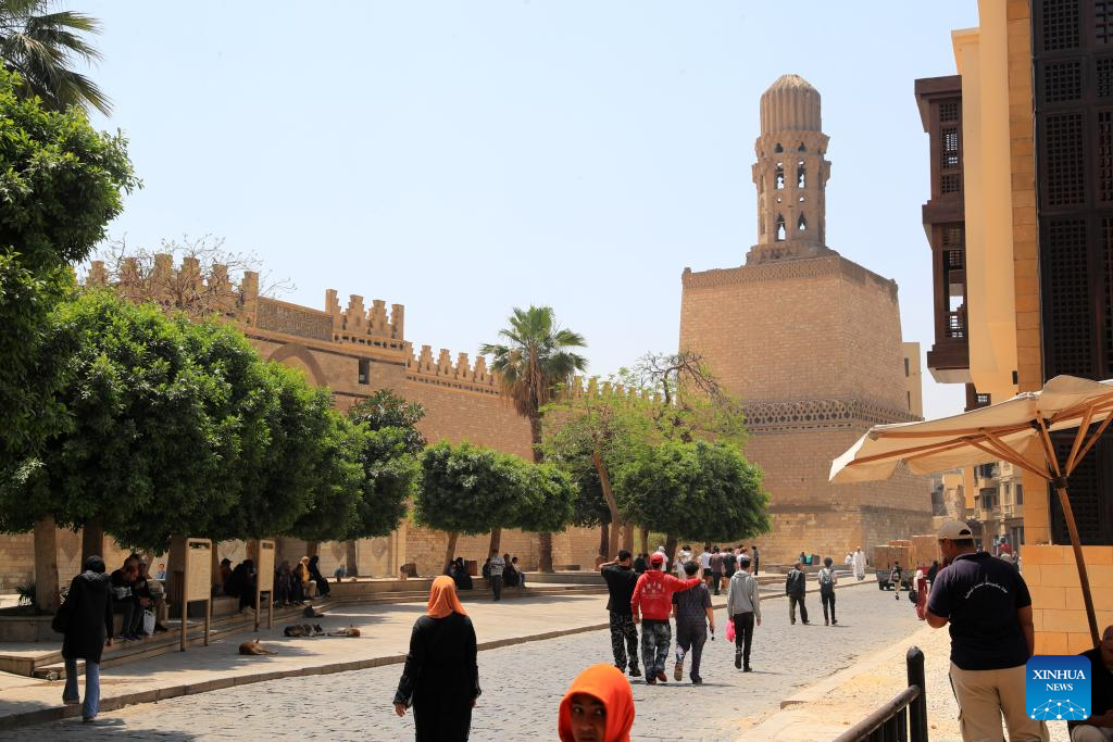 Tourists visit the Mosque of al-Hakim bi-Amr Allah on the Al-Muizz Street in Cairo, Egypt, on April 19, 2025. With its sea of minarets, centuries-old mosques, and timeworn alleys, Cairo--a city steeped in history--is undertaking a massive effort to protect and revitalize its cultural and architectural heritage. (Xinhua/Sui Xiankai)