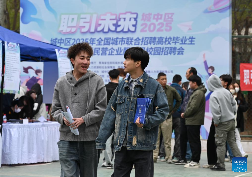 Students attend a campus job fair held at Qinghai College of Architectural Technology in Xining, northwest China's Qinghai Province, April 23, 2025. The job fair was attended by 45 employers who provided more than 1,700 vacancies to job seekers. (Xinhua/Qi Zhiyue)