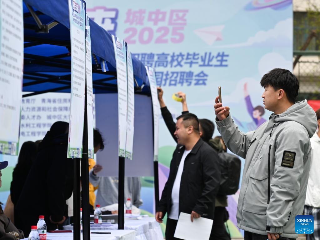 Students learn about recruitment information during a campus job fair held at Qinghai College of Architectural Technology in Xining, northwest China's Qinghai Province, April 23, 2025. The job fair was attended by 45 employers who provided more than 1,700 vacancies to job seekers. (Xinhua/Qi Zhiyue)