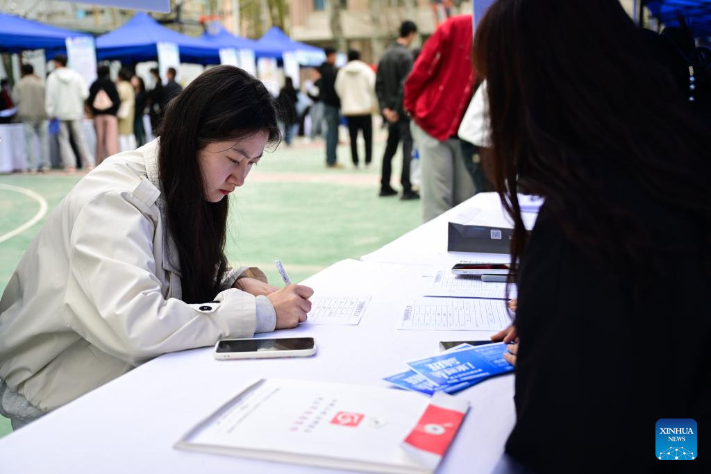 A student fills in her information during a campus job fair held at Qinghai College of Architectural Technology in Xining, northwest China's Qinghai Province, April 23, 2025. The job fair was attended by 45 employers who provided more than 1,700 vacancies to job seekers. (Xinhua/Zhang Long)