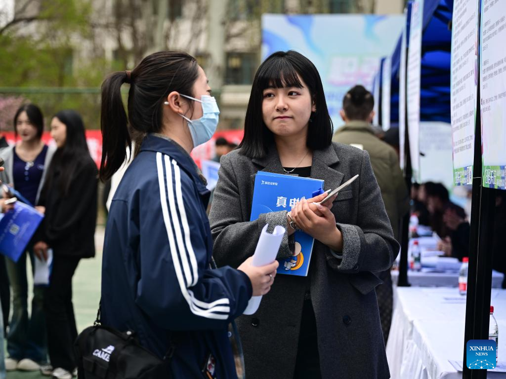 A student (L) talks with an employer during a campus job fair held at Qinghai College of Architectural Technology in Xining, northwest China's Qinghai Province, April 23, 2025. The job fair was attended by 45 employers who provided more than 1,700 vacancies to job seekers. (Xinhua/Zhang Long)