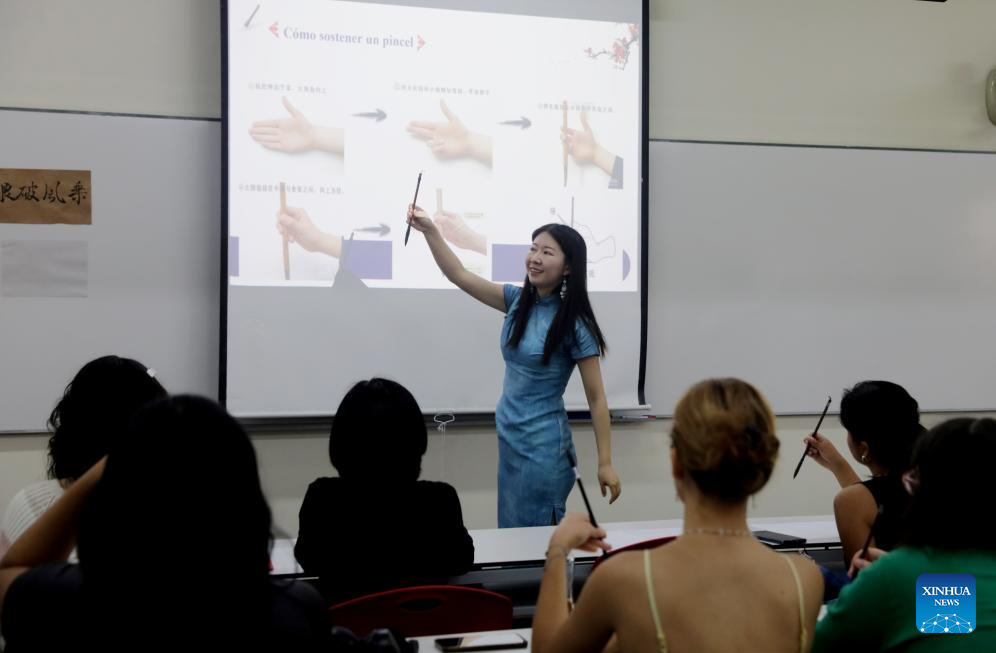 Liang Qing, a Chinese language teacher at the Confucius Institute of the Pontifical Catholic University of Peru, explains Chinese calligraphy to Peruvian students in Lima, capital of Peru, April 22, 2025. A series of activities to celebrate the International Chinese Language Day was held here on Tuesday by the Pontifical Catholic University of Peru. (Photo by Mariana Bazo/Xinhua)