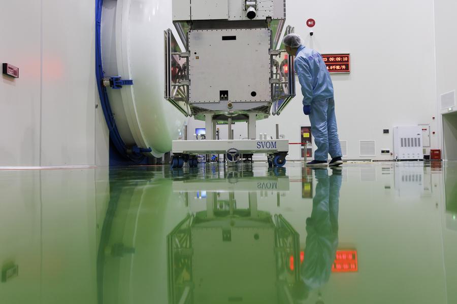 Wei Jianyan (R), Chinese principal investigator of the Space-based multi-band Variable Object Monitor (SVOM), and Bertrand Cordier, SVOM's French principal investigator, announce the first batch of scientific achievement obtained by Sino-French astronomical satellite at a ceremony for China's Space Day in east China's Shanghai, April 24, 2025. (Xinhua/Jin Liwang)The experimental simulation of the Space-based multi-band Variable Object Monitor (SVOM) is pictured at the Innovation Academy for Microsatellites of Chinese Academy of Sciences (CAS) in Shanghai, east China, April 23, 2025. (Xinhua/Jin Liwang)The experimental simulation of the Space-based multi-band Variable Object Monitor (SVOM) is pictured at the Innovation Academy for Microsatellites of Chinese Academy of Sciences (CAS) in Shanghai, east China, April 23, 2025. (Xinhua/Jin Liwang)■