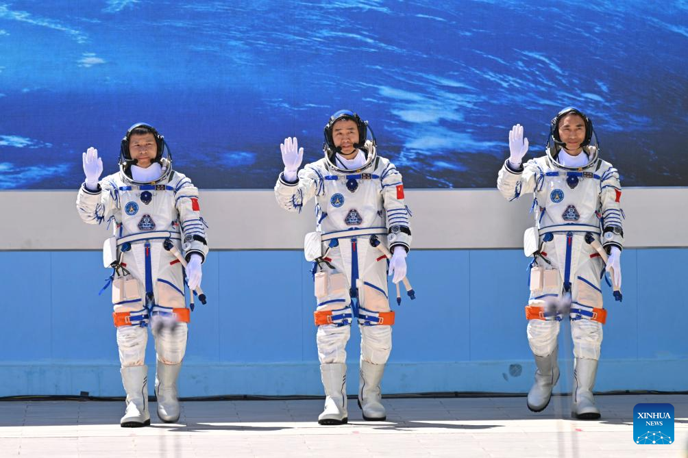 Chinese astronauts Chen Dong (C), Chen Zhongrui (R) and Wang Jie attend a send-off ceremony at the Jiuquan Satellite Launch Center in northwest China on April 24, 2025. A send-off ceremony for the three Chinese astronauts of the Shenzhou-20 crewed space mission was held here on Thursday, according to the China Manned Space Agency. (Xinhua/Li Xin)