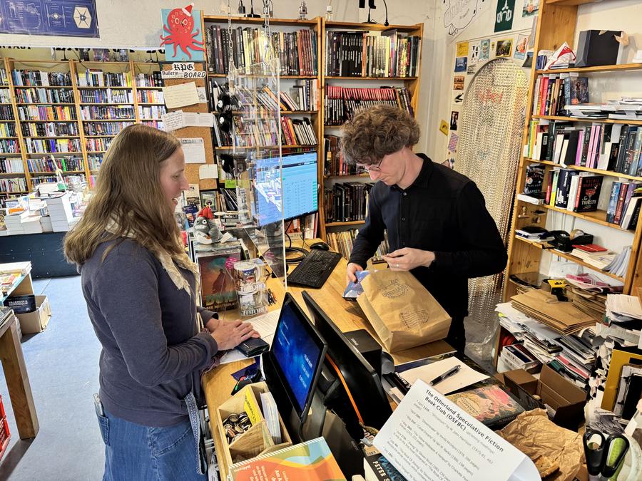 Overall, Otherland holds a collection of about 11,500 titles, with over one-third dedicated to science fiction in both English and German, according to Tress. He noted that while Otherland will not make the owners rich, their shop is doing well.