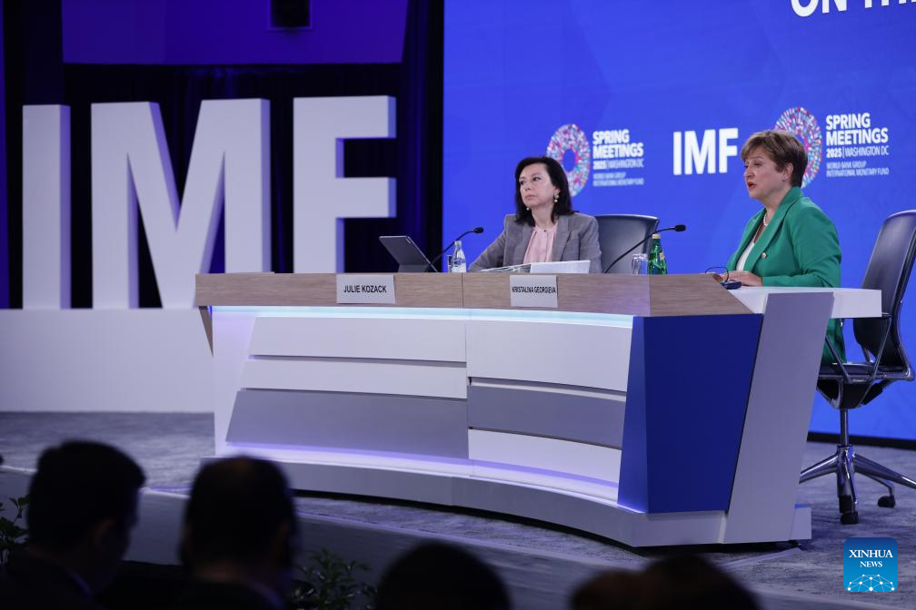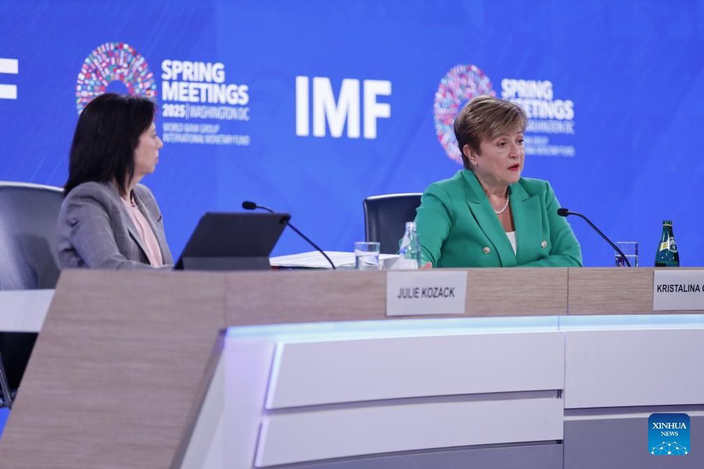 International Monetary Fund (IMF) Managing Director Kristalina Georgieva (R) speaks at a press conference during the 2025 Spring Meetings of the World Bank Group and IMF in Washington, D.C., the United States, on April 24, 2025. International Monetary Fund (IMF) Managing Director Kristalina Georgieva said on Thursday that significant shifts in trade policies have led to a sharp increase in uncertainty, calling on countries to engage in constructive cooperation and resolve trade disputes promptly. (Xinhua/Xie E)