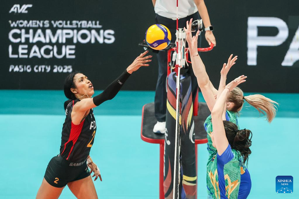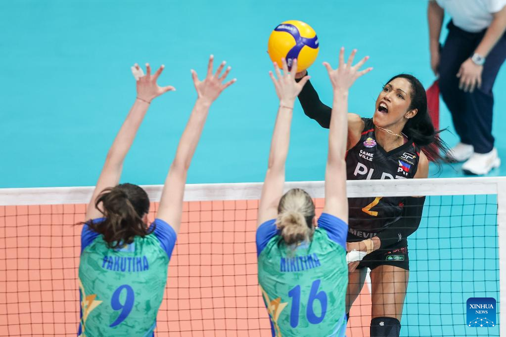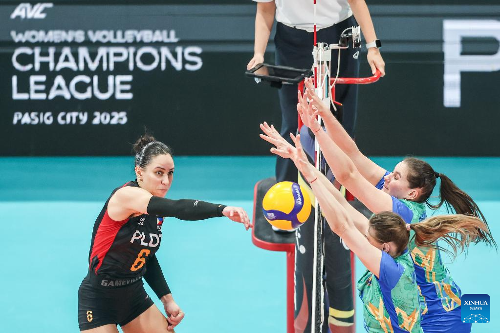 Tatyana Nikitina of Kazakhstan's Zhetysu VC competes during the quarterfinal match between Kazakhstan's Zhetysu VC and the Philippines' PLDT High Speed Hitters at the AVC Women's Volleyball Champions League in Pasig City, the Philippines, April 24, 2025. (Xinhua/Rouelle Umali)