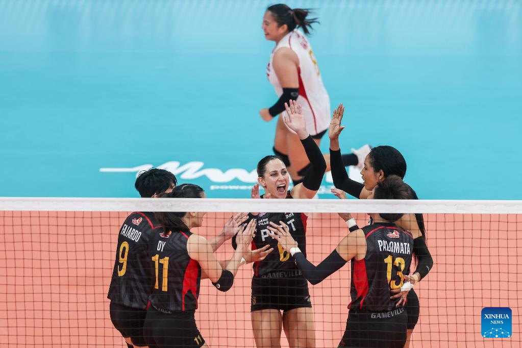Players of the Philippines' PLDT High Speed Hitters celebrate after scoring a point during the quarterfinal match between Kazakhstan's Zhetysu VC and the Philippines' PLDT High Speed Hitters at the AVC Women's Volleyball Champions League in Pasig City, the Philippines, April 24, 2025. (Xinhua/Rouelle Umali)