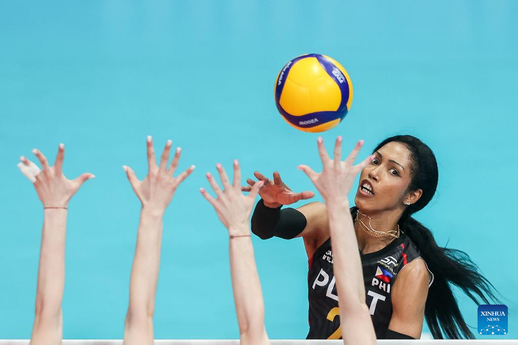 Rosell Wilma Salas (L) of the Philippines' PLDT High Speed Hitters spikes the ball during the quarterfinal match between Kazakhstan's Zhetysu VC and the Philippines' PLDT High Speed Hitters at the AVC Women's Volleyball Champions League in Pasig City, the Philippines, April 24, 2025. (Xinhua/Rouelle Umali)