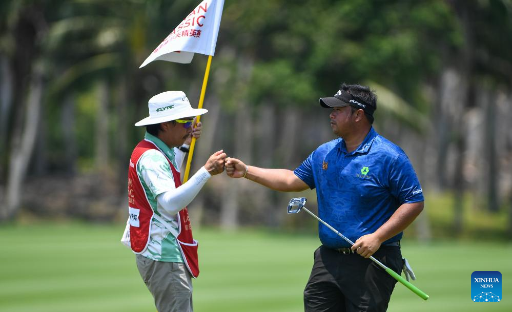 Kiradech Aphibarnrat of Thailand (R) celebrates after the round 1 at the Hainan Classic golf tournament of the DP World Tour in Haikou, south China's Hainan Province, April 24, 2025. (Xinhua/Yang Guanyu)