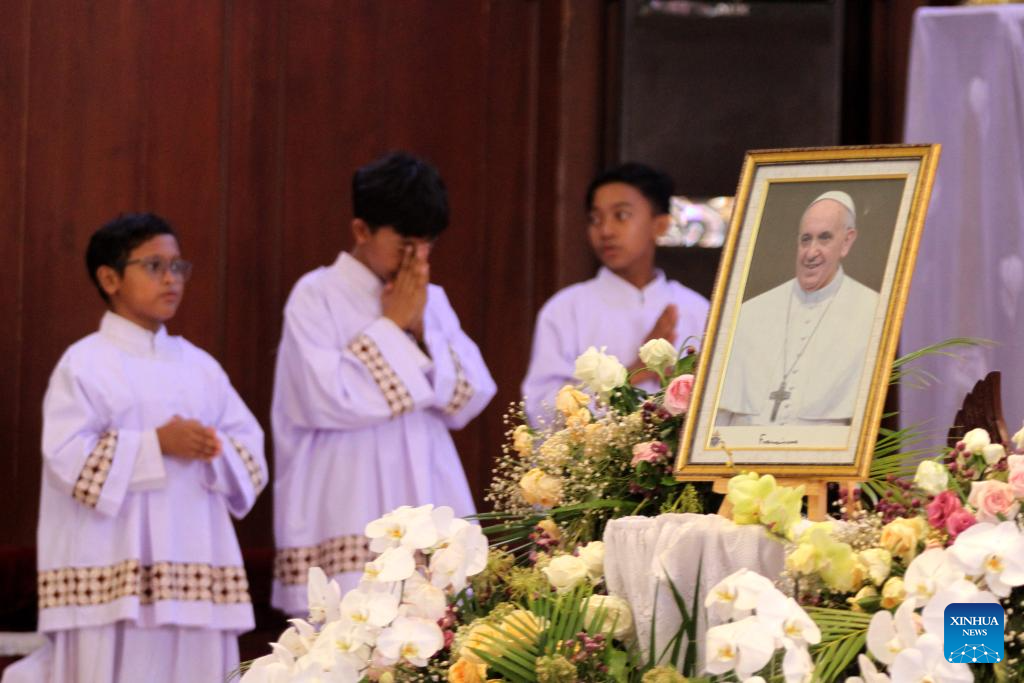 Children pay tribute during a memorial event for the late Pope Francis at a church in Surakarta, Indonesia, on April 23, 2025. Pope Francis, the 266th pontiff of the Roman Catholic Church, died Monday at the age of 88, said the Vatican in a statement. (Photo by Bram Selo/Xinhua)