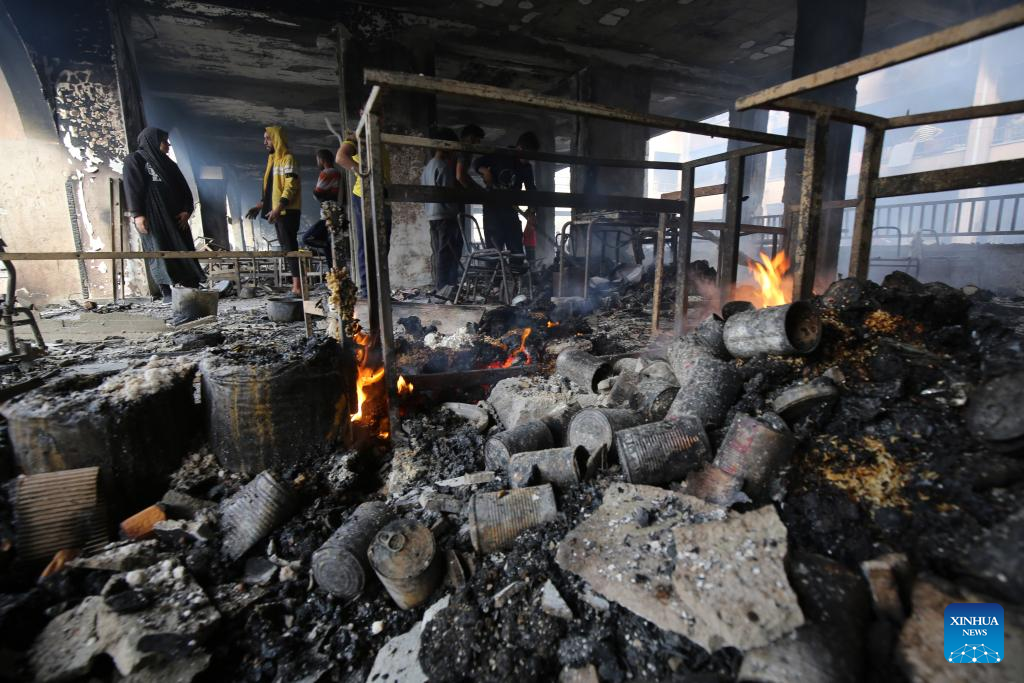 Palestinians are seen at a school after an Israeli airstrike in Gaza City, on April 23, 2025. Israel's Shin Bet domestic security agency and the military said on Wednesday that a deadly overnight airstrike targeting a school sheltering displaced families in northern Gaza was aimed at militants. Gaza's health authorities said the strike killed at least 10 people and caused fires in tents and classrooms at the school. (Photo by Rizek Abdeljawad/Xinhua)