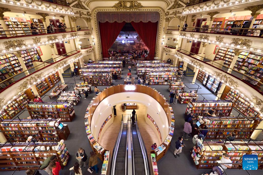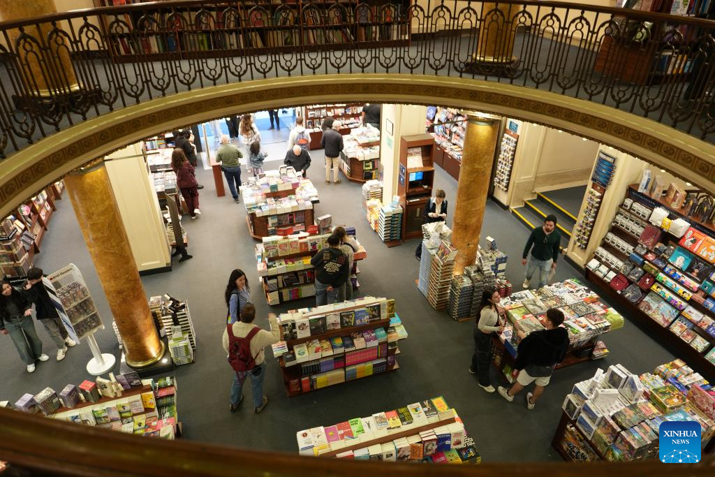 Readers select books at the Librería El Ateneo in Buenos Aires, Argentina, April 21, 2025. El Ateneo Grand Splendid (Librería El Ateneo) is a world-famous bookstore located in Buenos Aires. It used to be a theater opened in 1919 as a landmark building of Buenos Aires. The building was renovated and converted into a bookstore in 2000. Every year, it attracts over a million visitor trips. (Xinhua/Zhang Duo)