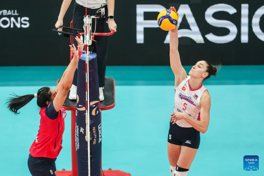 Anastassiya Kolomoyets (R) of the Philippines' Creamline Cool Smashers competes during the quarterfinal match between Thailand's Nakhon Ratchasima Qmin C VC and the Philippines' Creamline Cool Smashers at the AVC Women's Volleyball Champions League in Pasig City, the Philippines, April 24, 2025. (Xinhua/Rouelle Umali)
