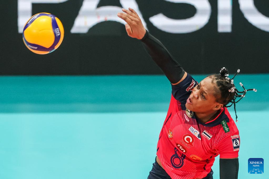 Anyse Smith of Thailand's Nakhon Ratchasima Qmin C VC competes during the quarterfinal match between Thailand's Nakhon Ratchasima Qmin C VC and the Philippines' Creamline Cool Smashers at the AVC Women's Volleyball Champions League in Pasig City, the Philippines, April 24, 2025. (Xinhua/Rouelle Umali)