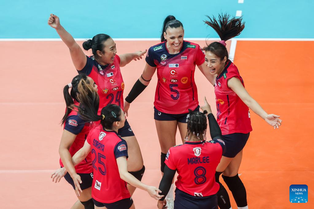 Players of Thailand's Nakhon Ratchasima Qmin C VC celebrate after scoring a point during the quarterfinal match between Thailand's Nakhon Ratchasima Qmin C VC and the Philippines' Creamline Cool Smashers at the AVC Women's Volleyball Champions League in Pasig City, the Philippines, April 24, 2025. (Xinhua/Rouelle Umali)