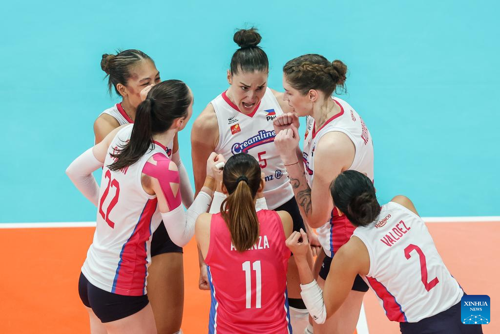 Players of the Philippines' Creamline Cool Smashers celebrate after scoring a point during the quarterfinal match between Thailand's Nakhon Ratchasima Qmin C VC and the Philippines' Creamline Cool Smashers at the AVC Women's Volleyball Champions League in Pasig City, the Philippines, April 24, 2025. (Xinhua/Rouelle Umali)