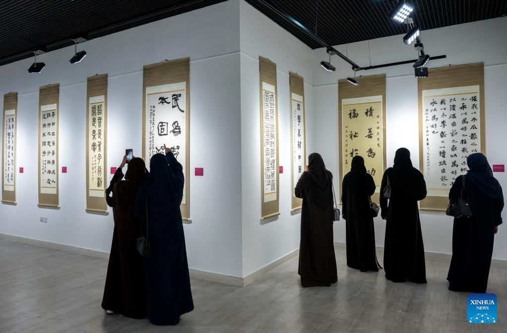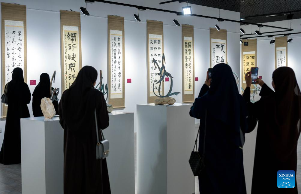 People visit the "Dialogue of Letters Between Qatar and China" calligraphy exhibition at Katara Cultural Village in Doha, Qatar, April 24, 2025. The exhibition opened here on Wednesday, aiming at promoting cultural and art exchanges between the two countries. (Photo by Nikku/Xinhua)
