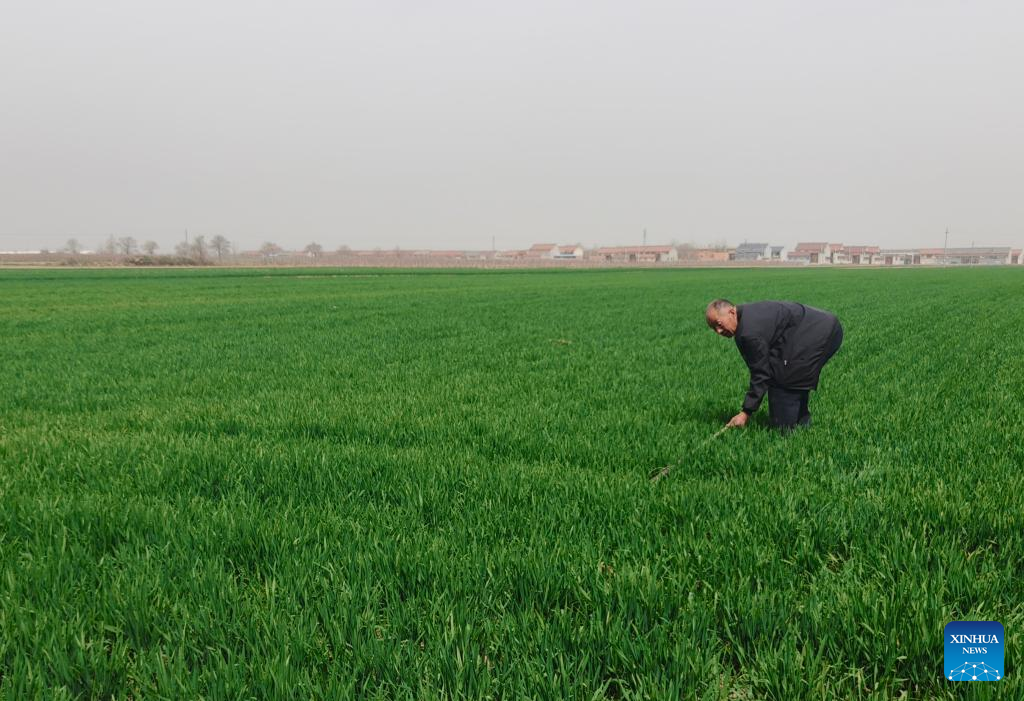 Ding Chengmin inspects irrigation facilities in a field in Ronghe Township of Wanrong County in Yuncheng City, north China's Shanxi Province, March 26, 2025. (Xinhua/Wang Hao)