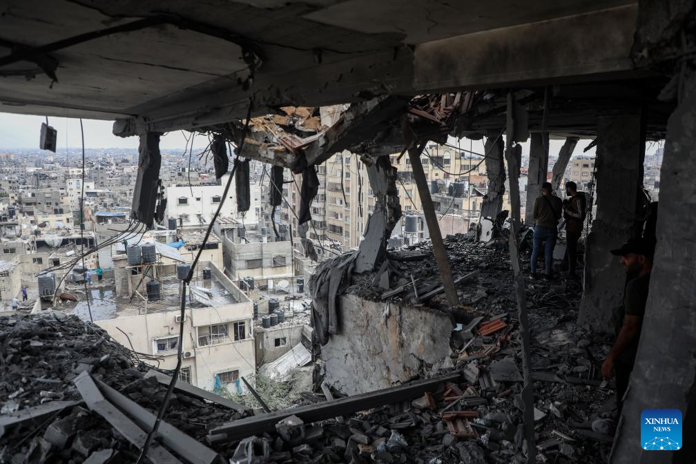 Palestinians check a destroyed apartment building after an Israeli airstrike in Gaza City, on April 24, 2025. At least 29 Palestinians were killed on Thursday in multiple Israeli airstrikes across the Gaza Strip, according to Gaza's civil defense. (Xinhua/Rizek Abdeljawad)