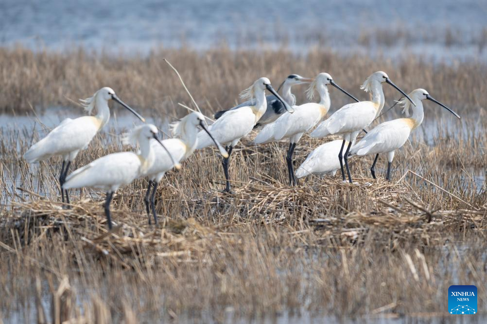 A group of white spoonbills rest at the Qianhe Island tourist scenic area in Zhaodong City, northeast China's Heilongjiang Province, April 24, 2025. (Xinhua/Xie Jianfei)