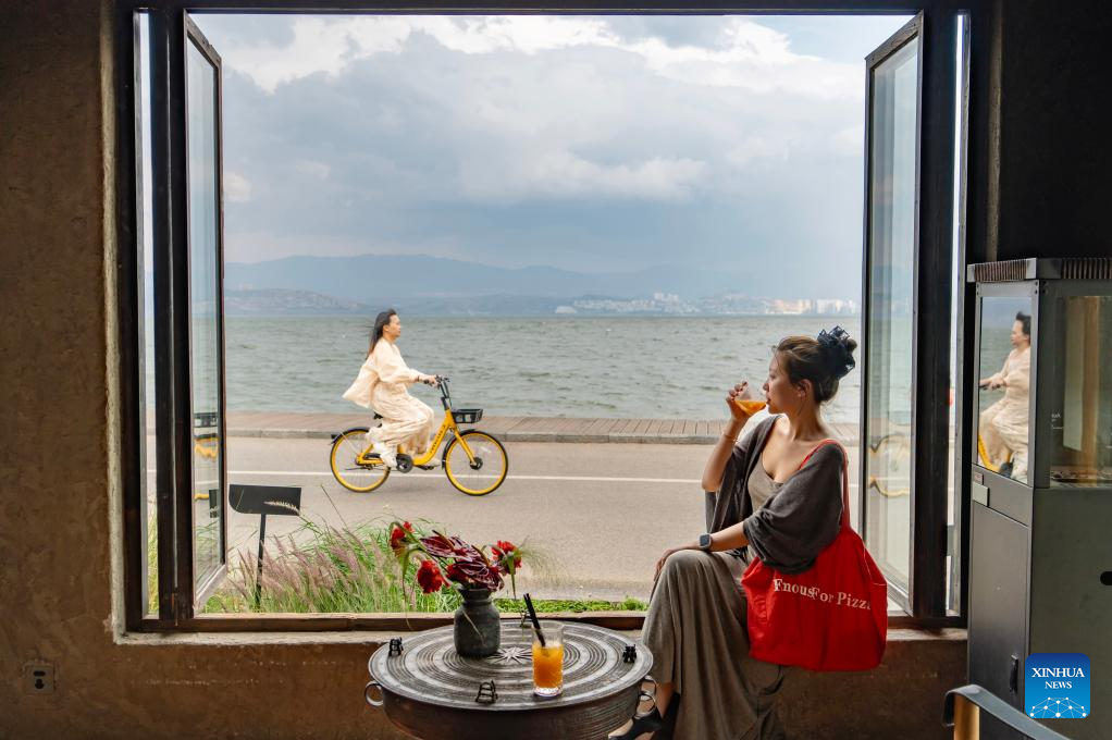A tourist enjoys the scenery of Erhai Lake at a cafe, while a cycling tourist passes by the window, in Dali, southwest China's Yunnan Province, April 23, 2025. (Xinhua/Liu Lianfen)