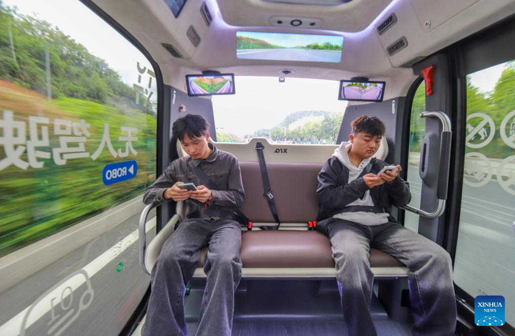 People take a ride on a driverless bus in Guiyang, southwest China's Guizhou Province, April 24, 2025. The first driverless bus line in Guizhou Province is in trial operation and is expected to be launched soon. (Xinhua/Liu Xu)