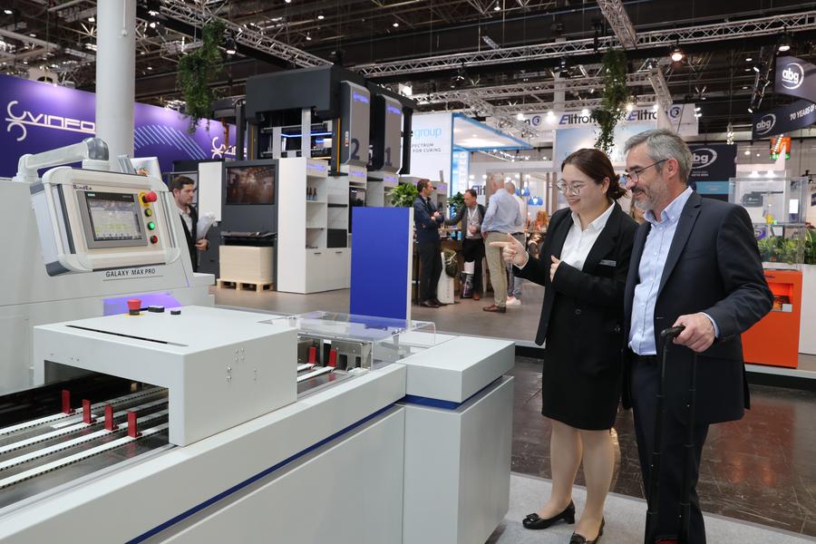Christoph Suender, Print Shop Workshop Manager of the Gutenberg Museum, showcases the Gutenberg printing technique in Mainz, Germany, March 21, 2025. (Xinhua/Zhang Fan)A staff member of a Chinese company introduces a product to a French visitor at Drupa, an international exhibition in the printing industry, in Dusseldorf, Germany, May 31, 2024. (Xinhua/Du Zheyu)