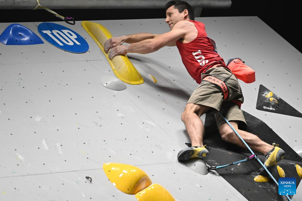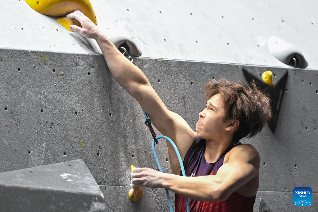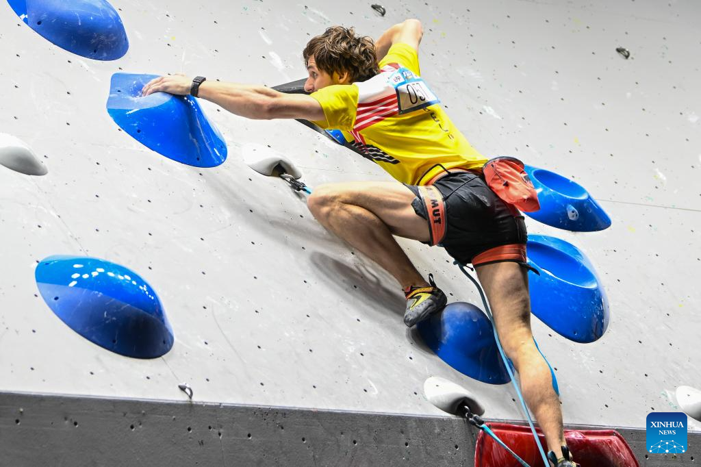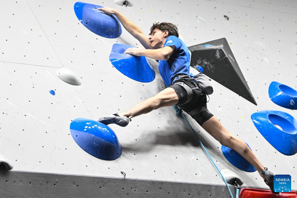 Nicolas Collin of Belgium competes during the men's lead qualification at the IFSC World Cup Wujiang 2025 in Suzhou, east China's Jiangsu Province, April 25, 2025. (Photo by Wang Xuzhong/Xinhua)