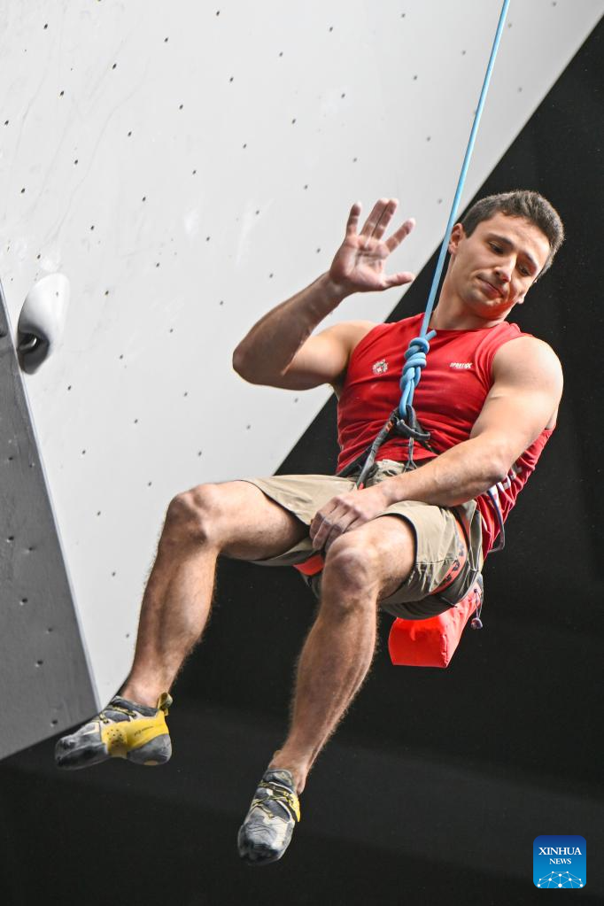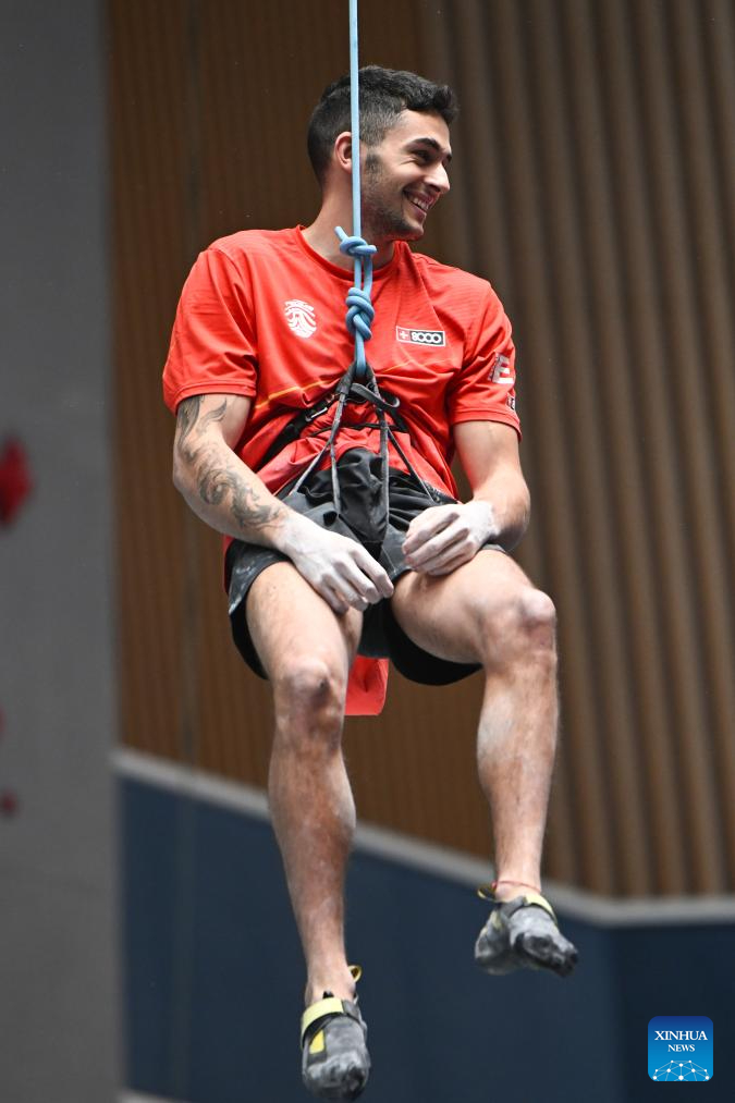 Sascha Lehmann of Switzerland reacts after the men's lead qualification at the IFSC World Cup Wujiang 2025 in Suzhou, east China's Jiangsu Province, April 25, 2025. (Photo by Wang Xuzhong/Xinhua)