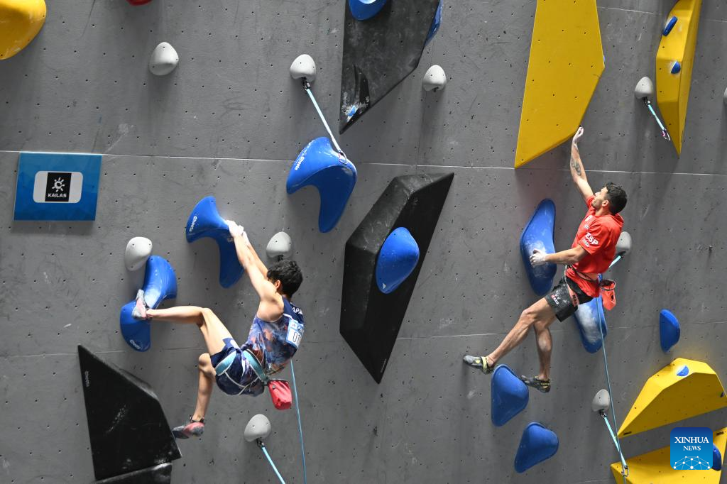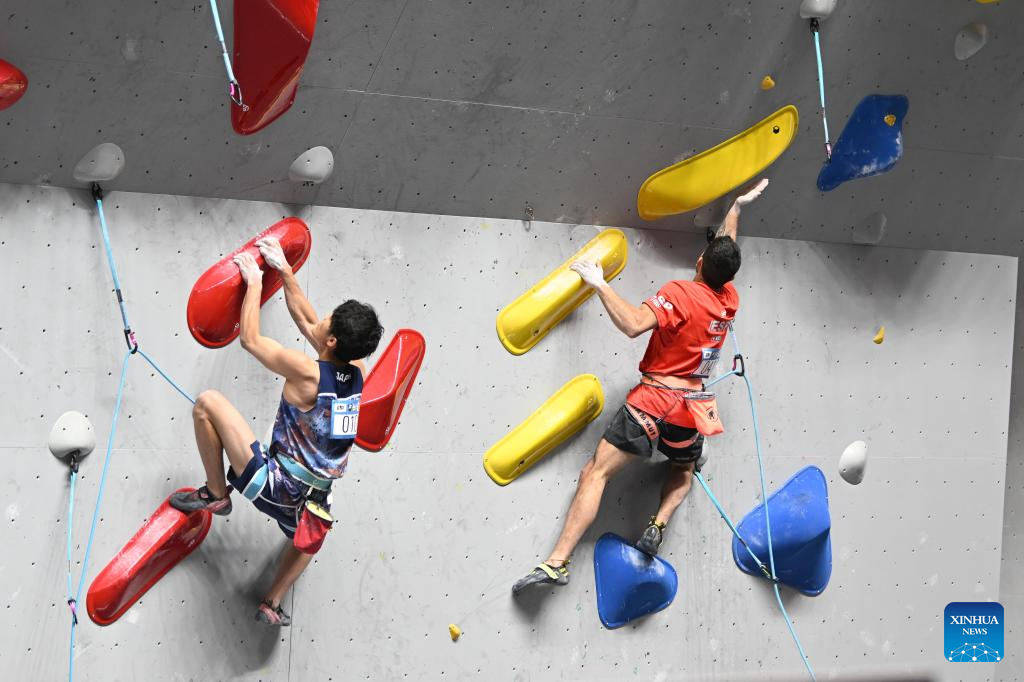 Alberto Gines Lopez (R) of Spain and Anraku Sorato of Japan compete during the men's lead qualification at the IFSC World Cup Wujiang 2025 in Suzhou, east China's Jiangsu Province, April 25, 2025. (Photo by Wang Xuzhong/Xinhua)