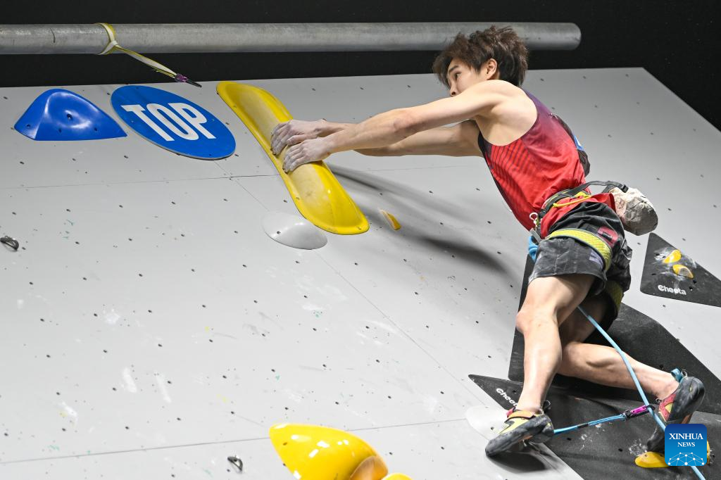 Pan Yufei of China competes during the men's lead qualification at the IFSC World Cup Wujiang 2025 in Suzhou, east China's Jiangsu Province, April 25, 2025. (Photo by Wang Xuzhong/Xinhua)