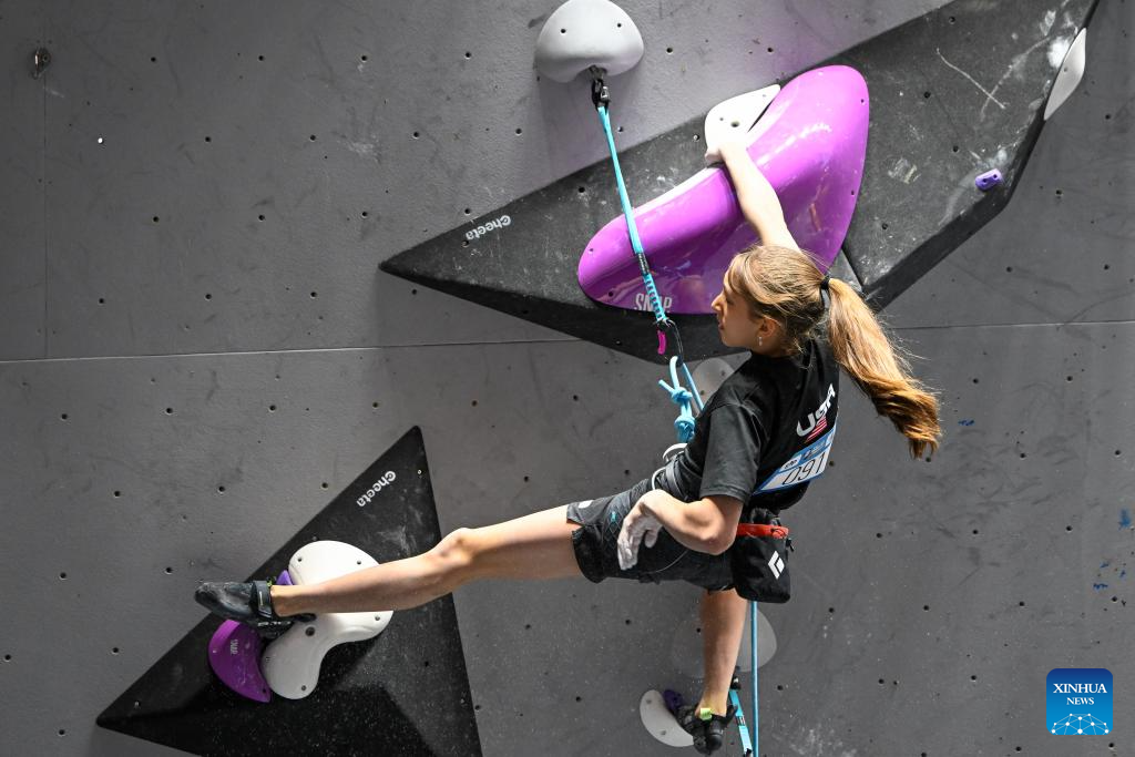 Annie Sanders of the United States competes during the women's lead qualification at the IFSC World Cup Wujiang 2025 in Suzhou, east China's Jiangsu Province, April 25, 2025. (Photo by Wang Xuzhong/Xinhua)