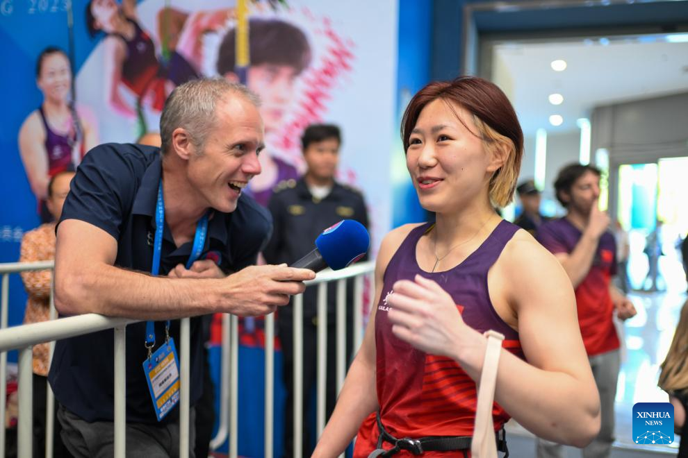 Zhang Yuetong (R) of China is interviewed after the women's lead qualification at the IFSC World Cup Wujiang 2025 in Suzhou, east China's Jiangsu Province, April 25, 2025. (Photo by Wang Xuzhong/Xinhua)
