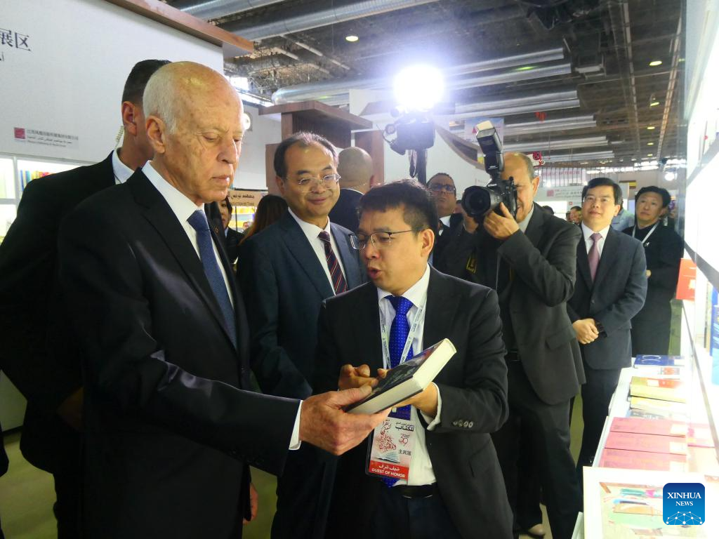 Tunisian President Kais Saied (1st L) visits the Chinese pavilion at the 39th edition of Tunis International Book Fair in Tunis, Tunisia, on April 25, 2025. The 39th Tunis International Book Fair kicked off here on Friday, with China as the guest of honor, presenting a diverse collection of Chinese publications. (Xinhua/Huang Ling)