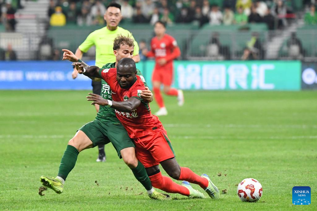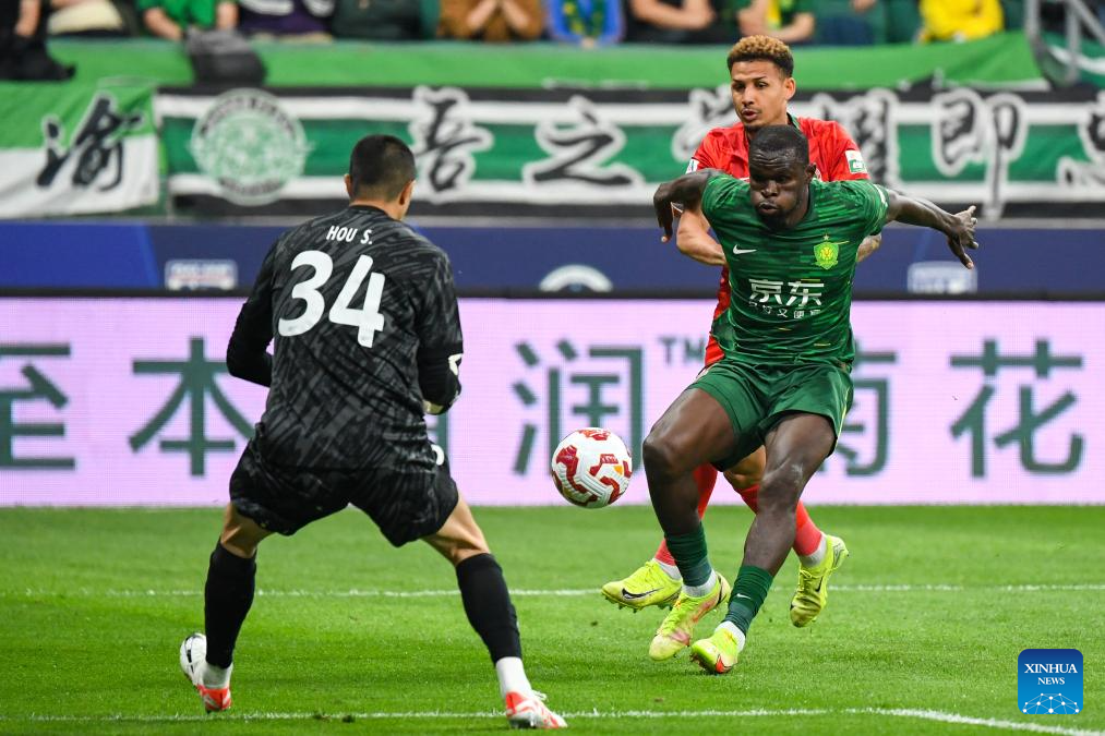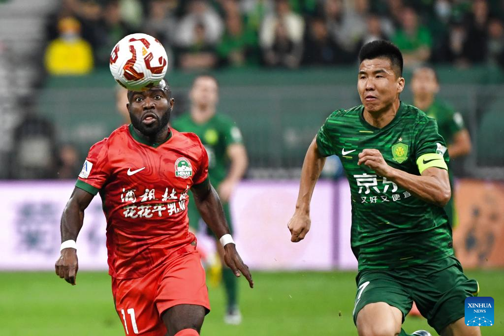Goncalo Rodrigues (L) of Beijing Guoan FC vies with Frank Acheampong of Henan FC during the 9th round match between Beijing Guoan FC and Henan FC at the 2025 season Chinese Football Super League (CSL) in Beijing, capital of China, April 25, 2025. (Xinhua/Ju Huanzong)