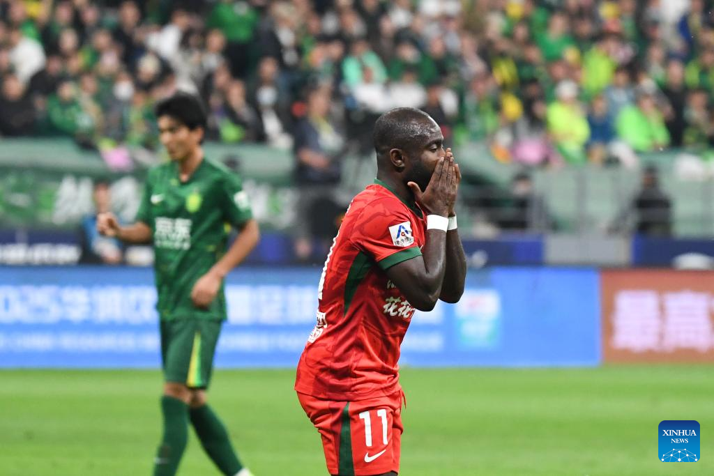 Frank Acheampong (R) of Henan FC reacts during the 9th round match between Beijing Guoan FC and Henan FC at the 2025 season Chinese Football Super League (CSL) in Beijing, capital of China, April 25, 2025. (Xinhua/Ju Huanzong)
