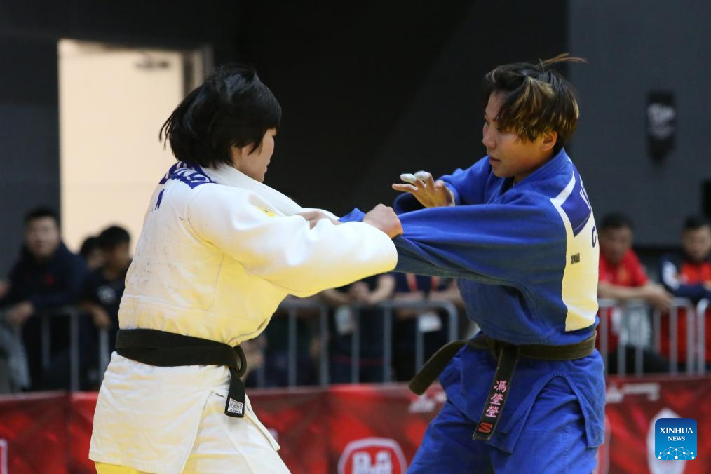 Feng Yingying (R) of China competes against Honda Mayu of Japan during the women's -70 kg final at the Asian Judo Championships in Bangkok, Thailand, April 26, 2025. (Xinhua/Rachen Sageamsak)